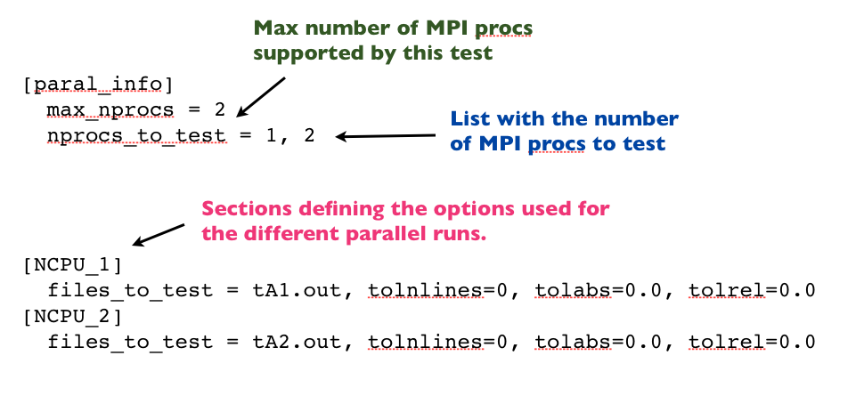 Then for each possible number of MPI processes we have a section whose name is constructed with the rule: NCPU_#nproc. A simplified example of TEST_INFO section for a multi-parallel test is reported below