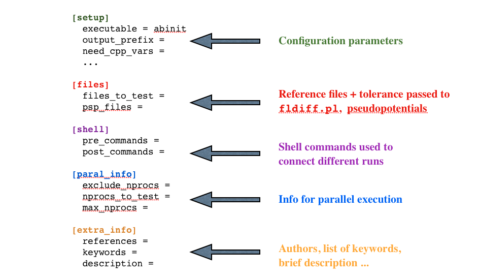 The <TEST_INFO> section is placed at the end of the input file in order to avoid problems with executables reading from standard input. The XML-like markers <BEGIN_TEST_INFO> and <END_TEST_INFO> enclose the section. Each line starts with the sentinel #%% that will be removed during the parsing. What is left is a standard INI configuration file providing all the information needed to run the test and to analyze the final results. The figure below shows how options are grouped in different sections: