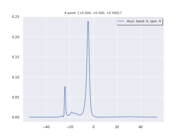 The spectral function is written in the file tgw2_4o_SIG. It is a simple text file. It contains, as a function of the frequency (eV), the real part of the self-energy, the imaginary part of the self-energy, and the spectral function. You can visualize it using your preferred software. For instance, start gnuplot and issue